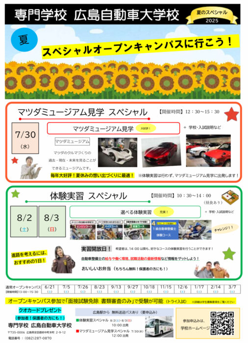 夏のスペシャルオープンキャンパスは、”マツダミュージアム見学スペシャル“と”体験実習スペシャル“です!ぜひ、ご参加くださいね( ^ω^ )★☆