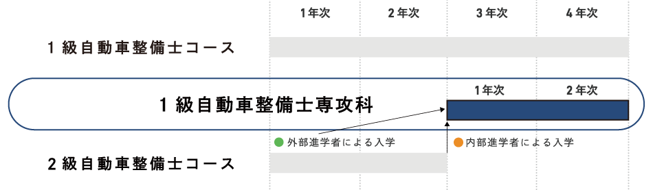 1級自動車整備士コースの3年次・4年次と同じ